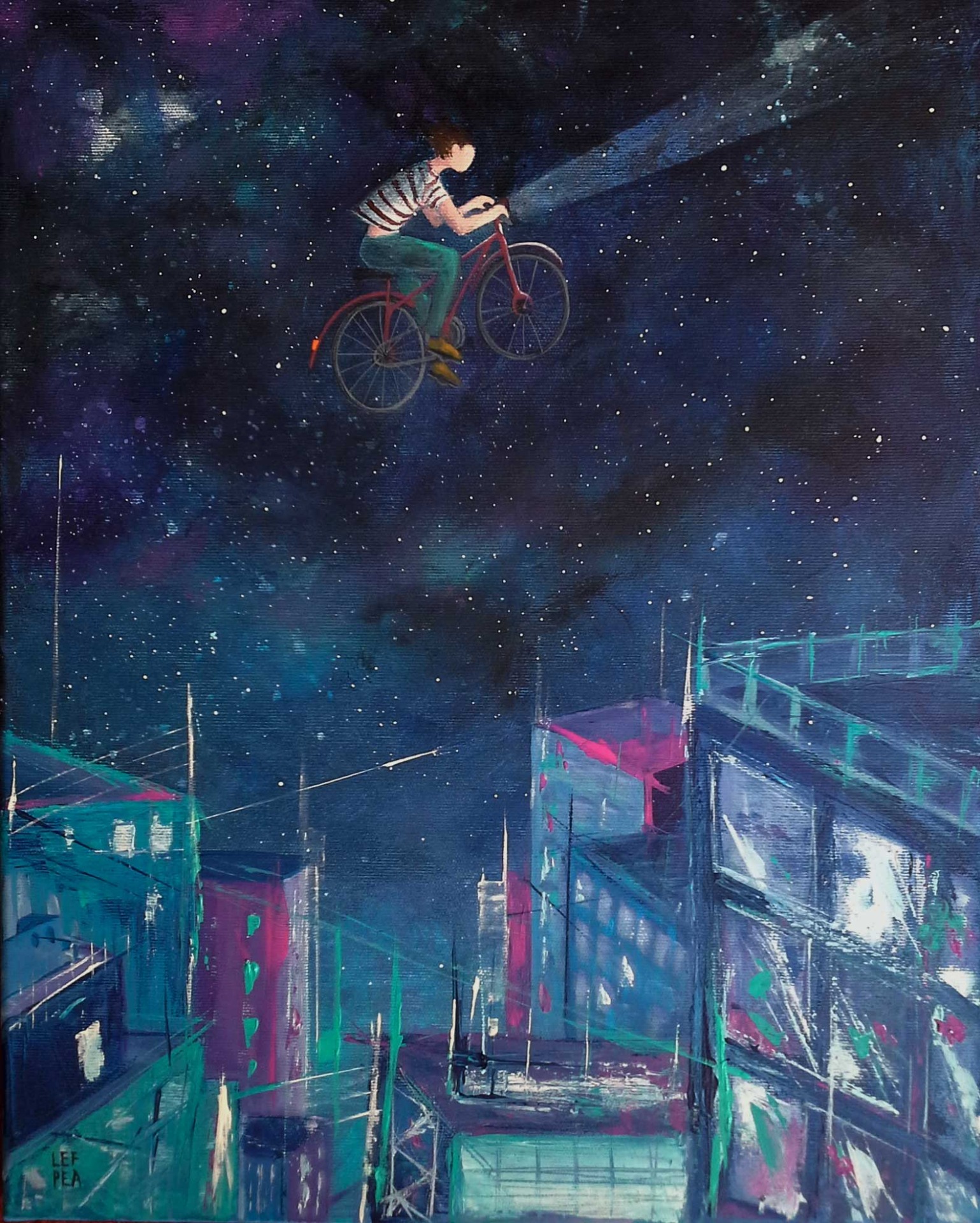V noci se nad tím městem projíždí na starém kole. Neznám jeho jméno. Už téměř není vidět, i hvězd prý ubývá. Jen někdy, když zapomene a nechá rozsvícené světlo mezi řídítky, občas ho spatřím. Jede dál a dál, žádná pravidla, žádná cesta. Nedívá se dolů, nespadne, nebojí se. Snad tančí nad městem, snad ho hlídá. Není neviditelný, jen málokdo však zvedne hlavu vzhůru a mlčí, když na zemi je tolik lákadel a zvuků. Většinou většinu nepřehlušíš, ale možná někdy někdo si bude ticho kupovat jako vzácnost. Mašle na balíčku s překvapením ani nehlesne, papír nemukne a obsah bude drahocenný.