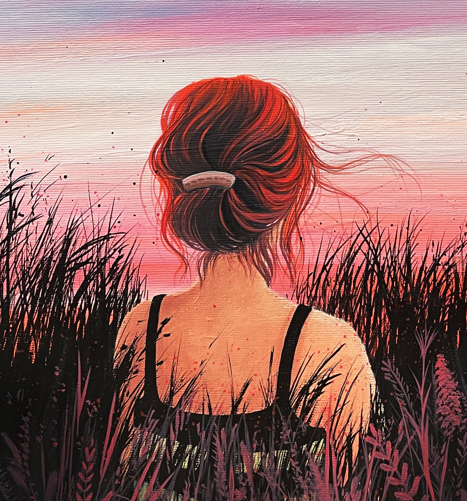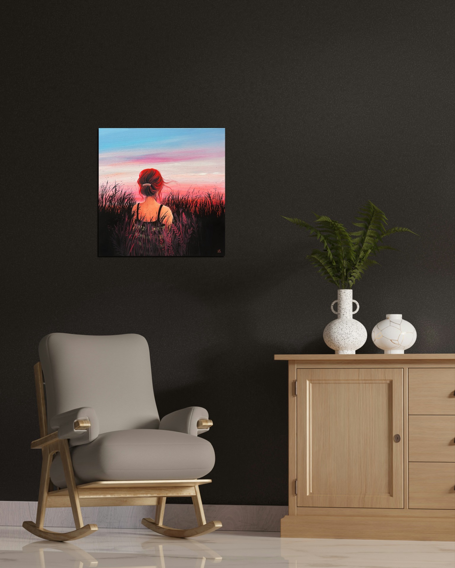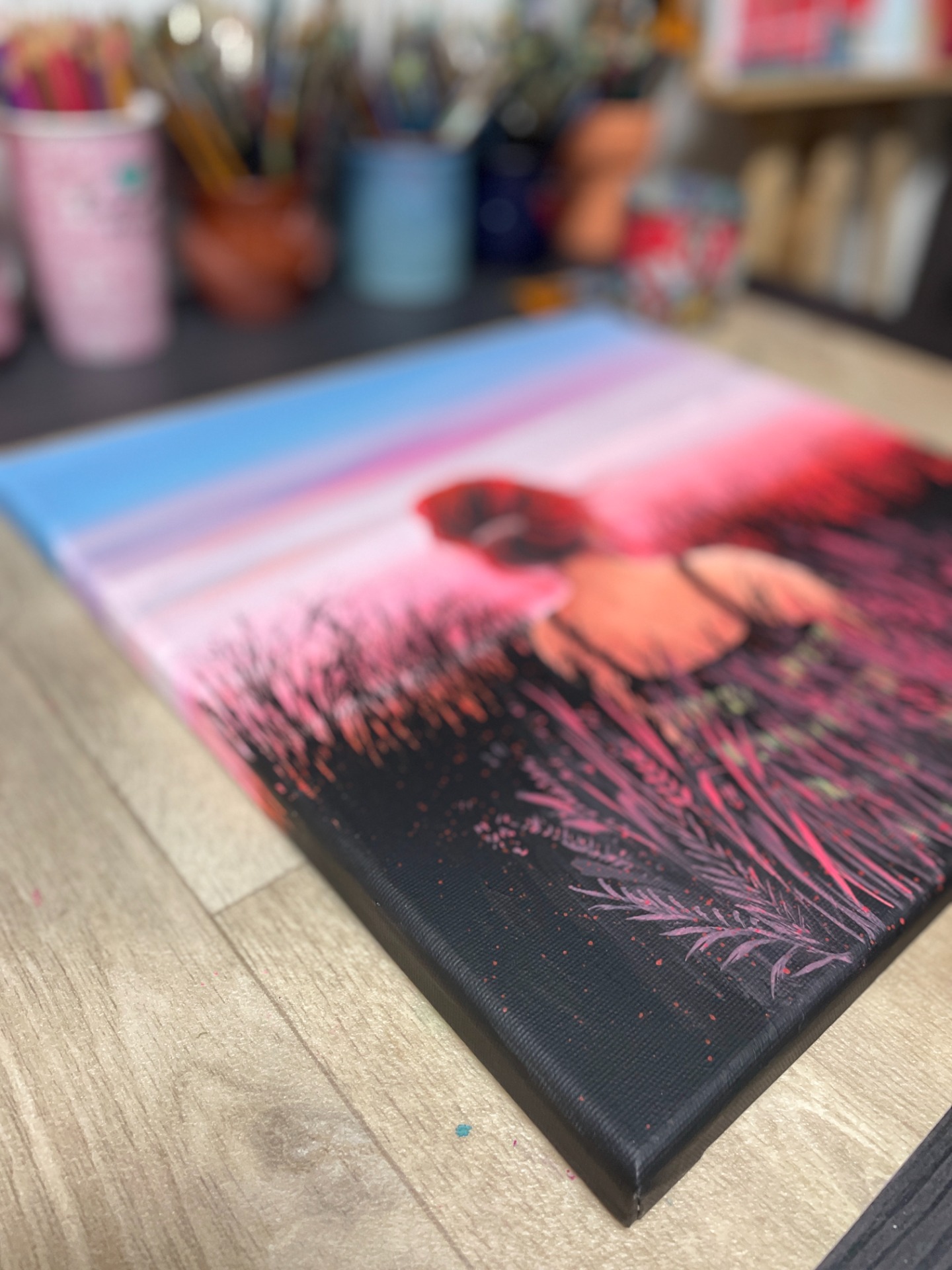 Na tento obraz na zakázku jsem se moc těšila. Chybí mi léto, ty teplé večery, kdy se člověk nemusí chumlat do bundy a čepice a může vyběhnout ven jen tak, spontánně, v tom co má zrovna na sobě. Vdechnout stmívání, roztáhnout ruce a celým srdcem volat vzhůru MI-LU-JUUU! Červánky mi malují rumělky do tváří ač se nestydím, vlasy mi čechrá letní vánek, tím nejopojnějším parfémem se navoněla louka sama a já tady jen jsem.