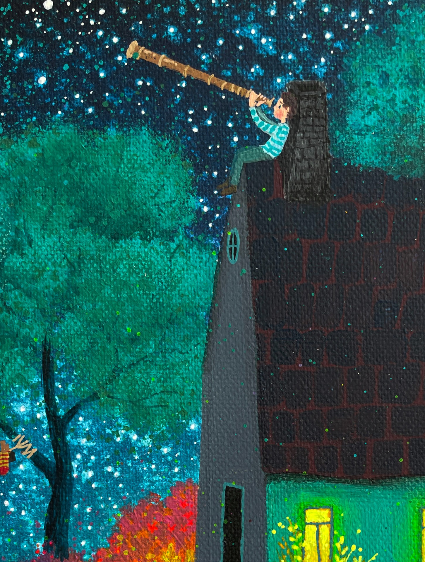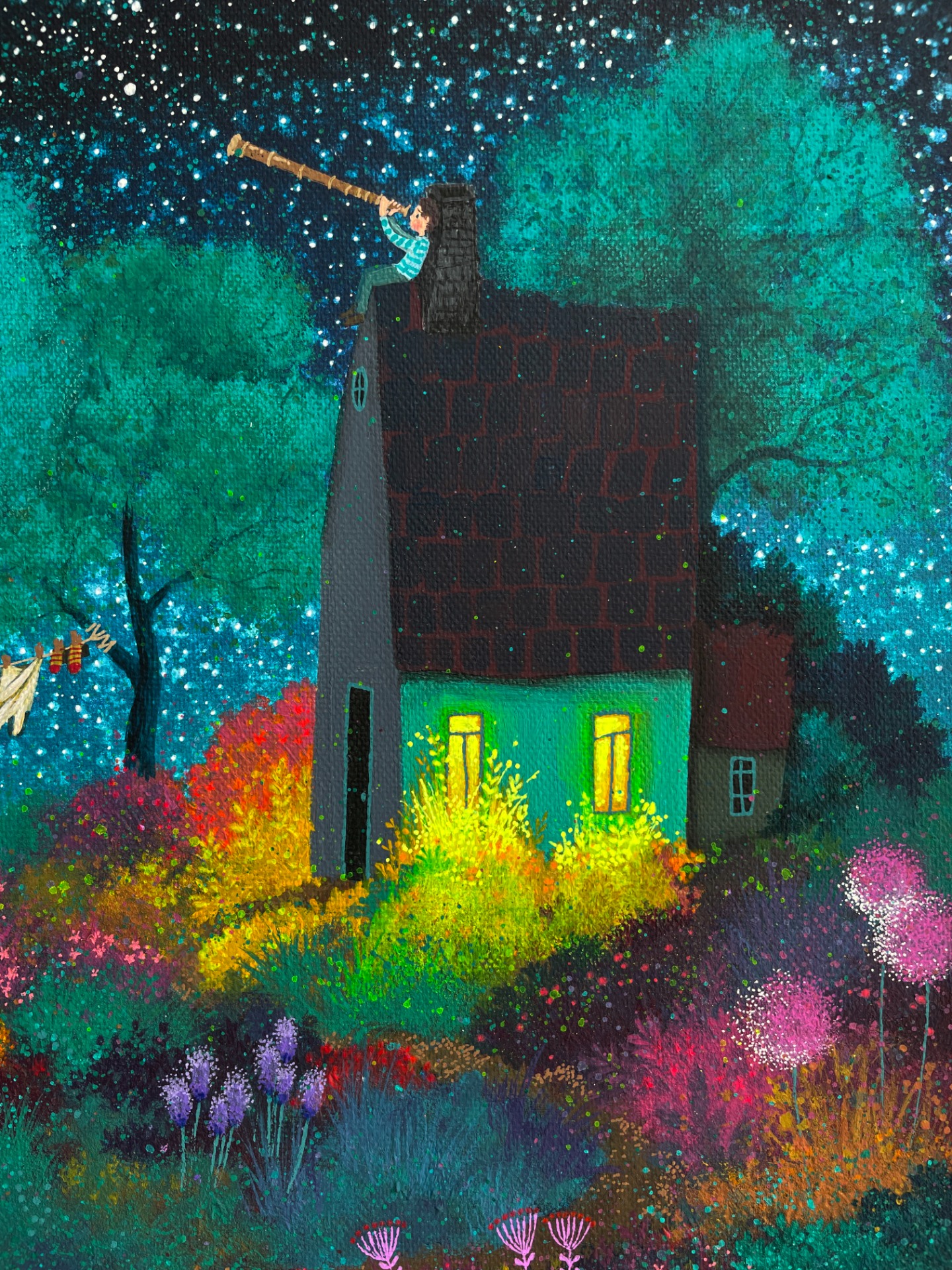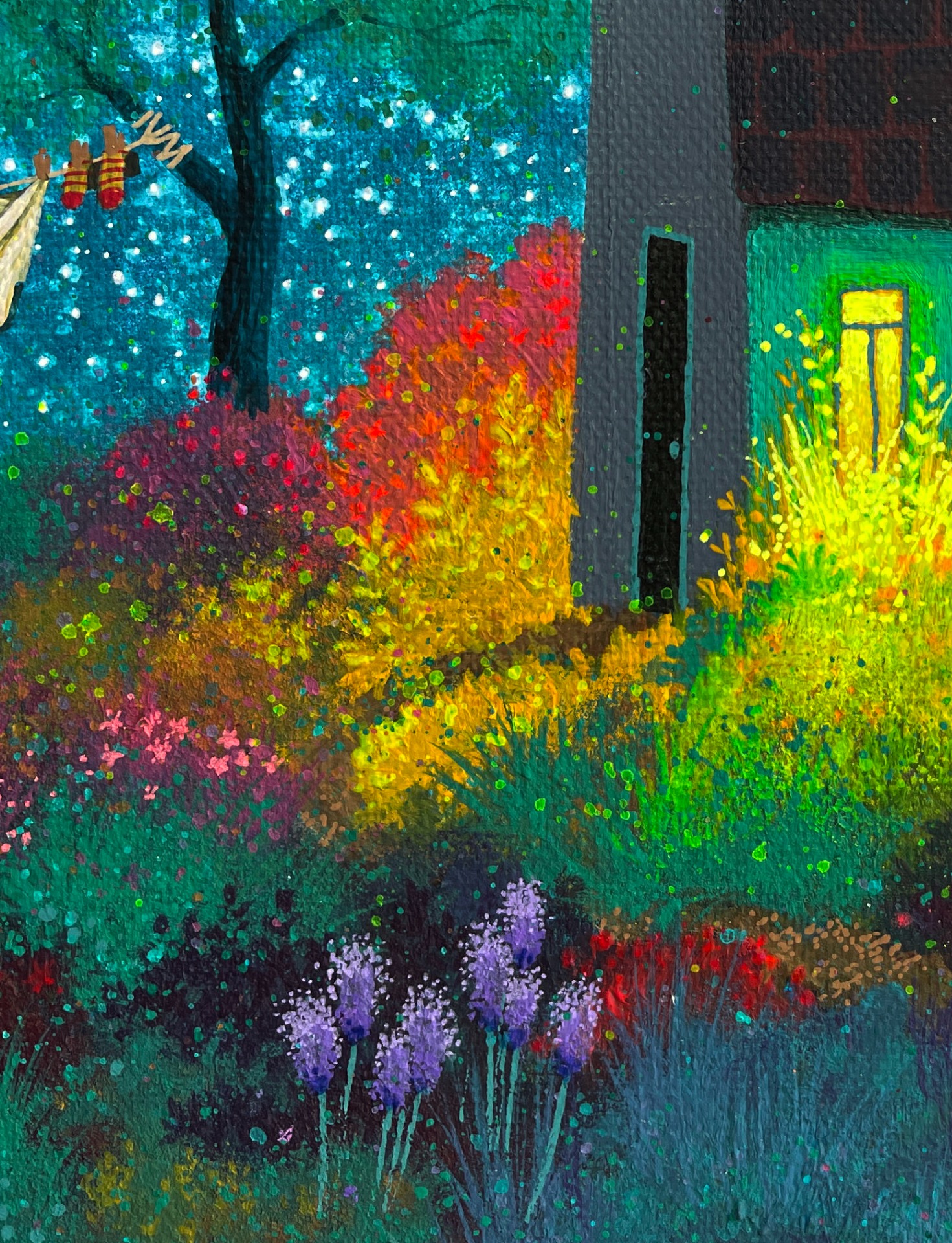 Mezi nebem a zemí, mezi mnou a noční oblohou, mezi mnou a zasutou zahradou… to ticho květin, které spí. Barva noci, fantazie, pohádkování, světýlkování mini detailů mě tak moc těší a baví, že se k tomuto tématu vracívám a toulám se v něm.