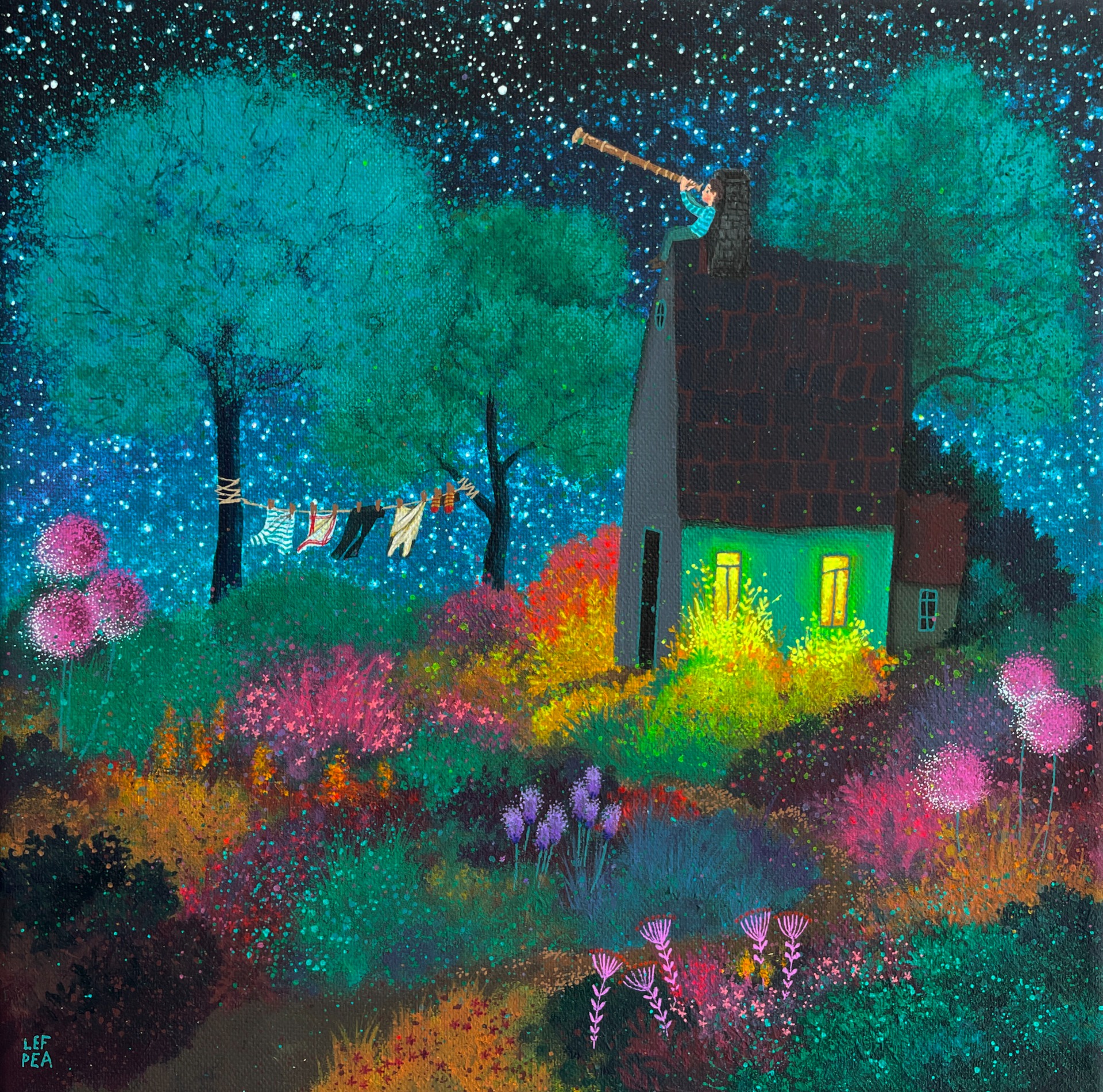 Barevnost se může ve skutečnosti malinko lišit dle závislosti na nastavení monitoru a množství světla při fotografování. Malovány i hrany, netřeba rámovat. Ošetřeno závěrečným lakem. Signováno LEF PEA. Na obraz i jeho kopie popř. tištěné fotografie se vztahují autorská práva.