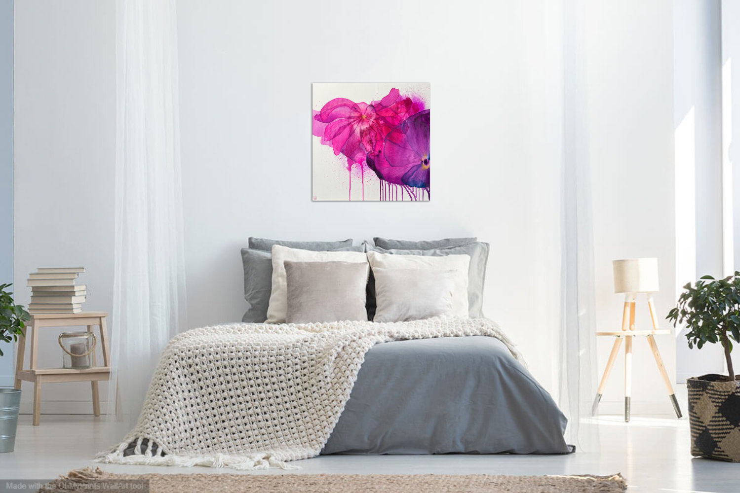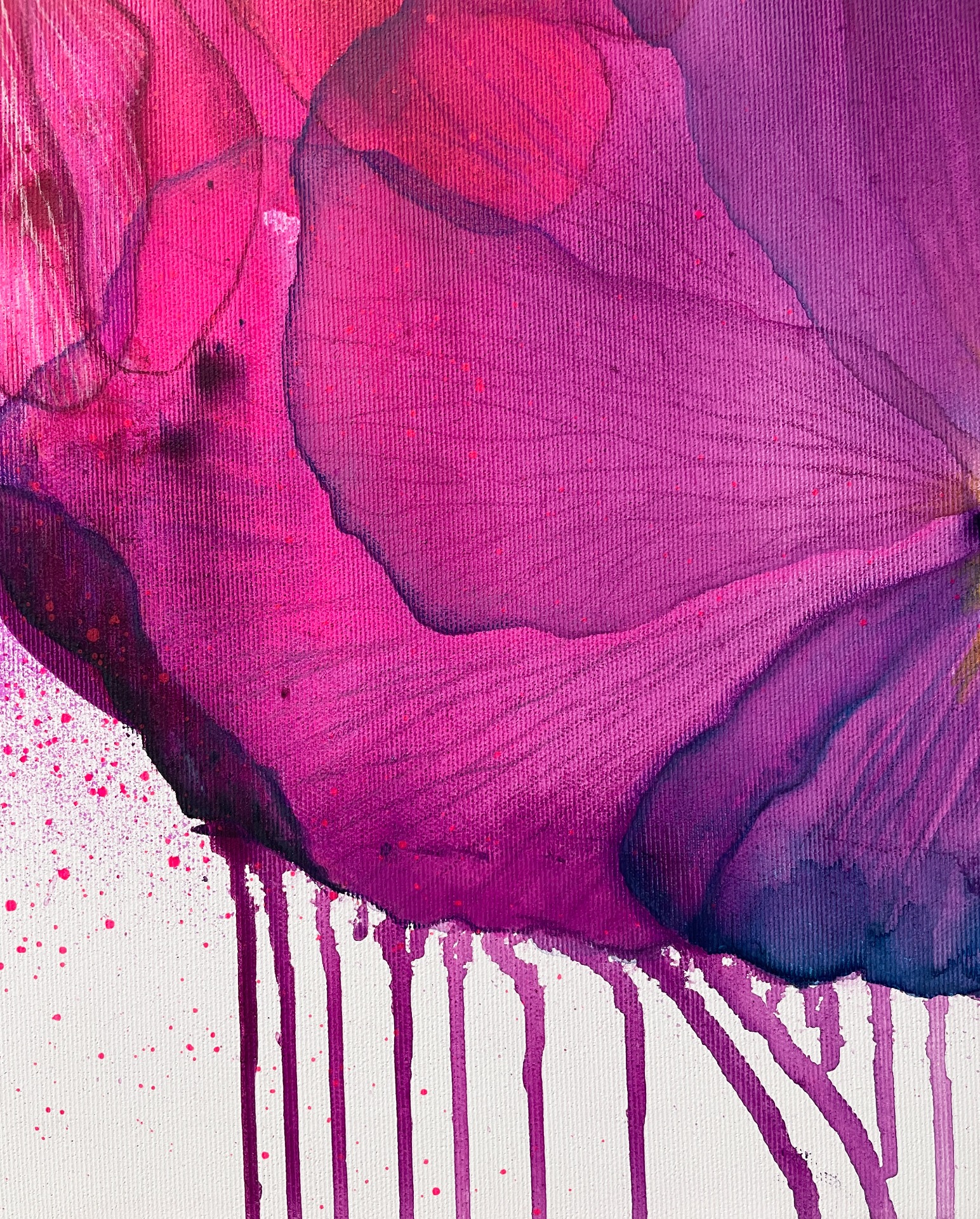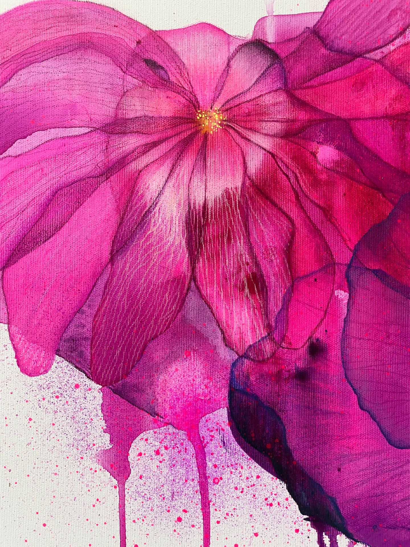 Obraz je jemnou abstraktní malbou s lehkým mikroskopickým pohledem na něco živého uvnitř květů. Nezachycuje jejich vnější podobu, ale vnitřní struktury, vrstvy a proudění. Nejde o botanické zobrazení ani o konkrétní druh. Květiny zde nejsou popisem reality, ale symbolickým prostorem života, místem, kde se odehrává tiché vnitřní dění. Motivem je propojení dvou květů a jejich sdílení. Dva samostatné živé celky, které se dotýkají, reagují na sebe, dýchají, snad společně sní. Skrze barvu a vnitřní energii.