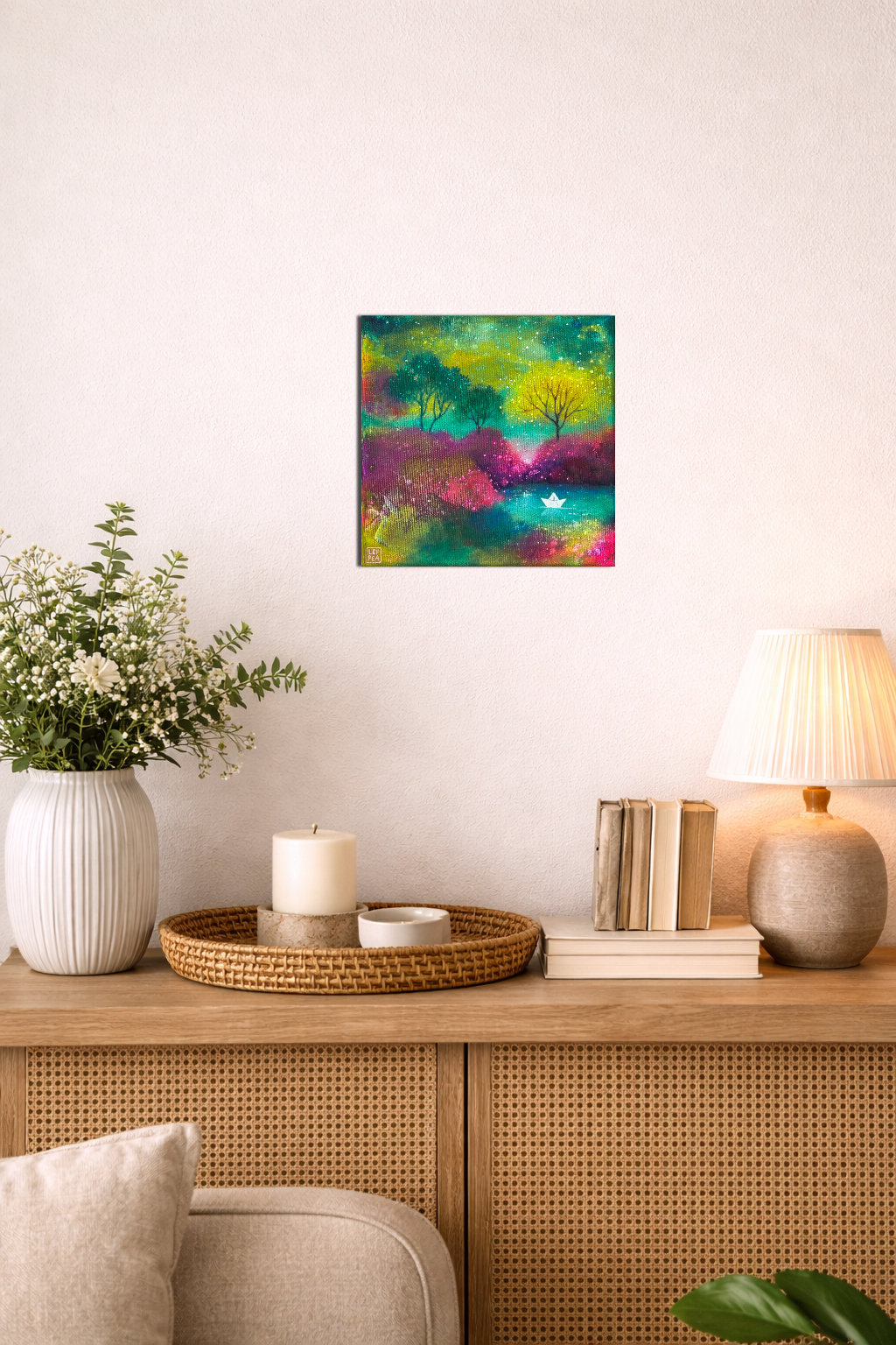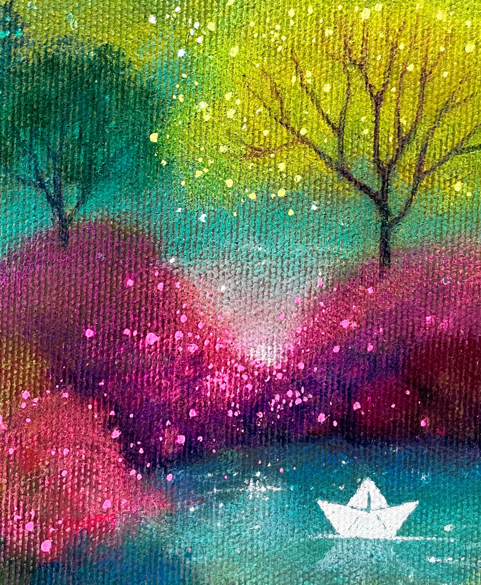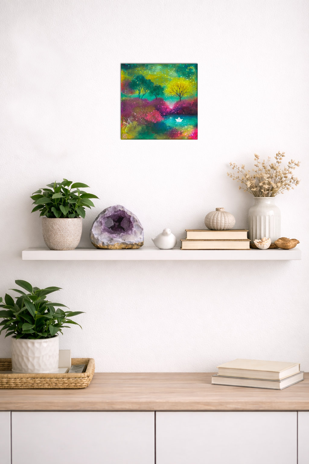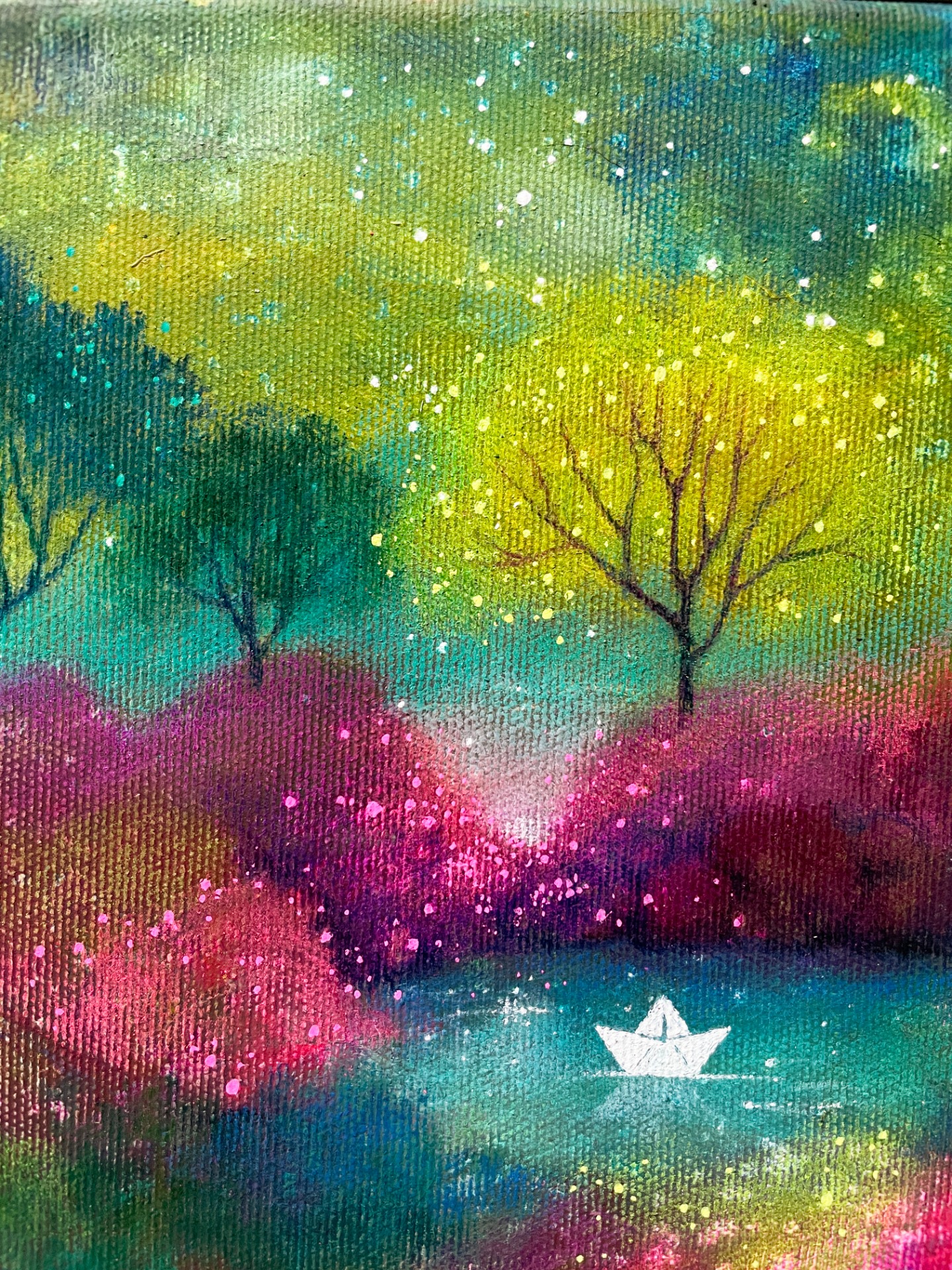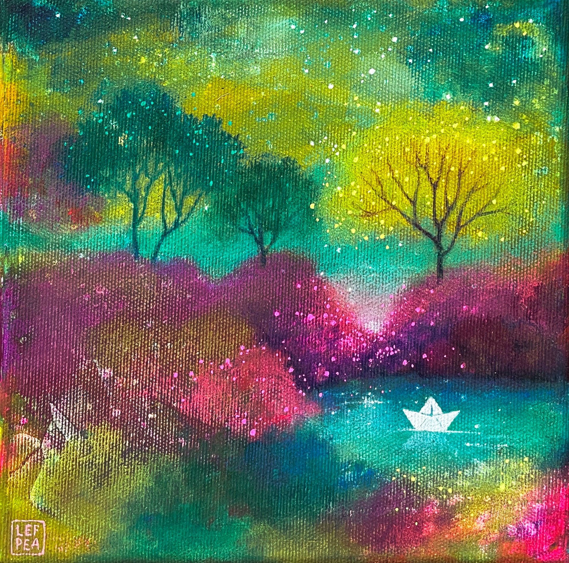 Občas pošlu do světa obraz za zvýhodněnou promo cenu. Tentokrát pluje na hladině papírová lodička v magické krajině.