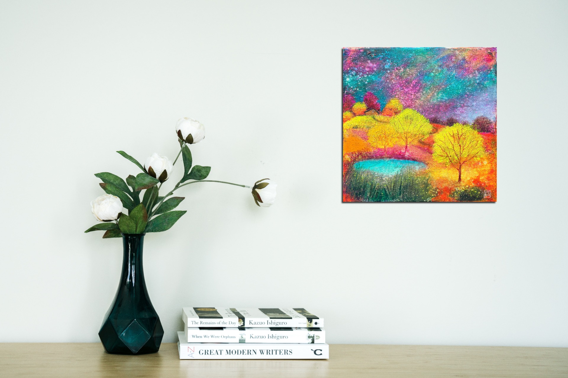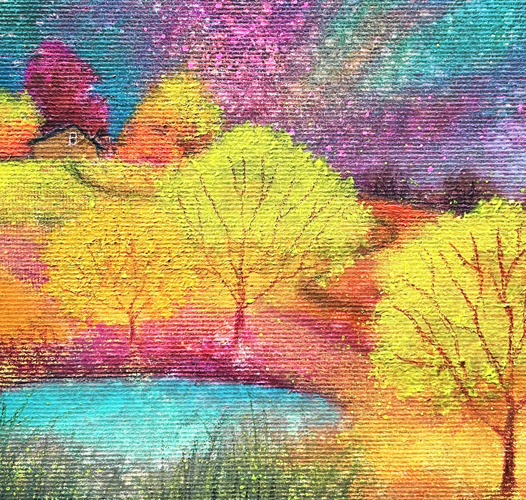 Originál malba, kombinovaná technika: Akryl+pastel, akvarelové pastelky, fixy na plátně, suchý pastel (šepsované plátno natažené na dřevěném rámu), velikost 20x20cm.