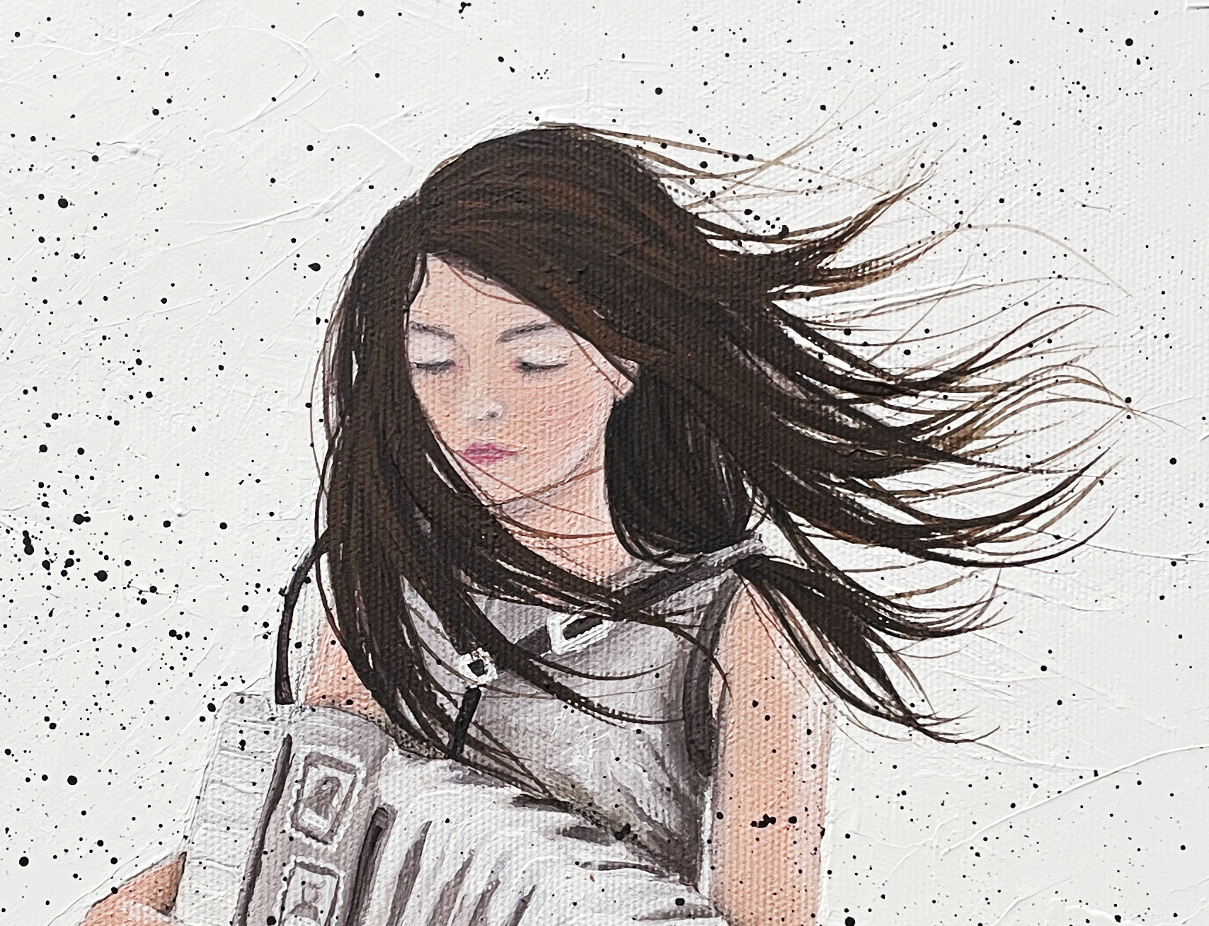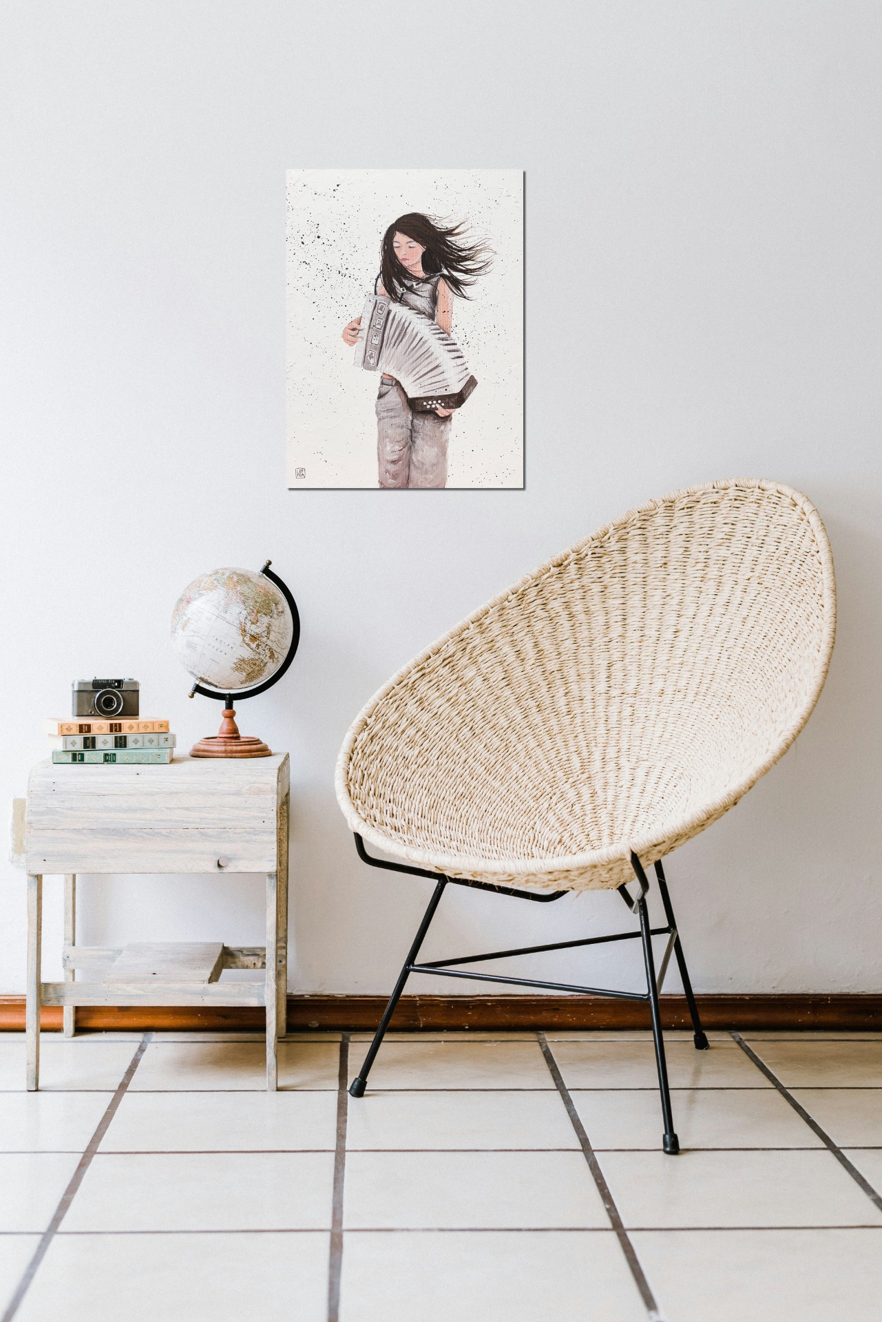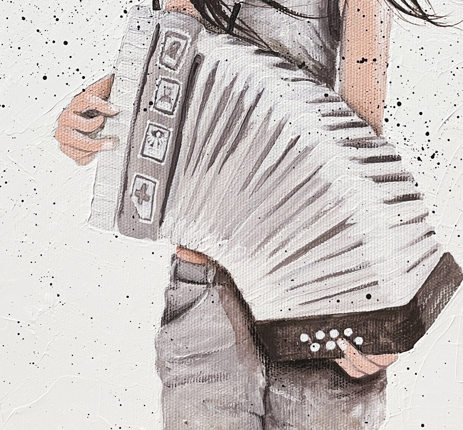 Originál - Akryl na plátně (šepsované plátno natažené na dřevěném rámu), velikost 30x40cm. Pozadí je malováno špachtlí, tudíž je viditelná struktura a vrstvení. Chtěla jsem tím docílit kontrastu mezi hudbou a okolním ruchem.