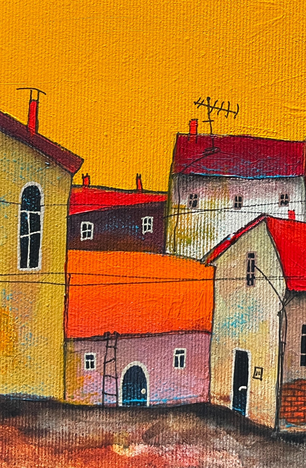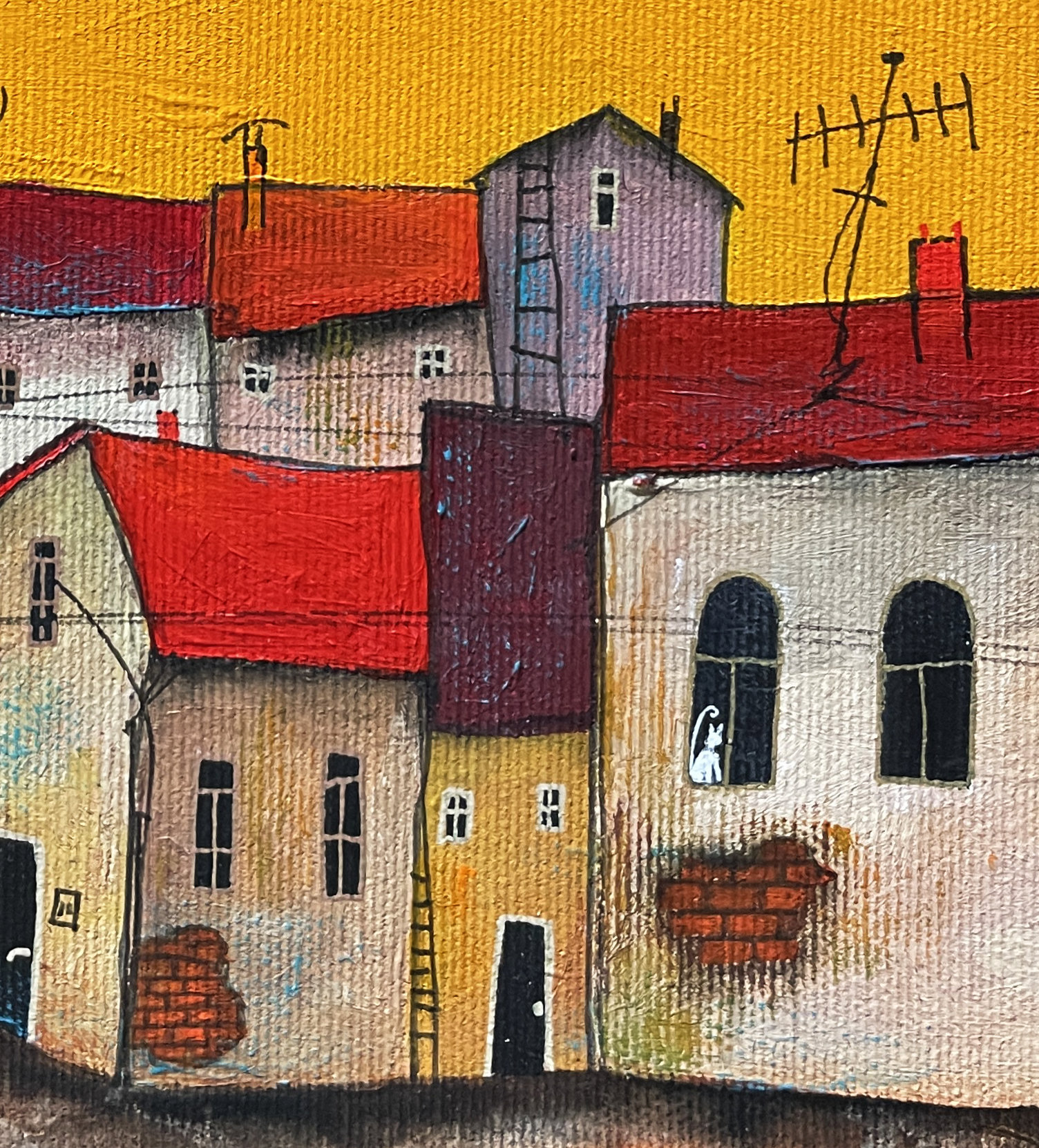 Vracím se k městu, střechy tančí. Z perspektivy střech obraz nabízí pocit volnosti a svobody, procházet se nad městem. Realita se mění v poeticku hru barev a tvarů.