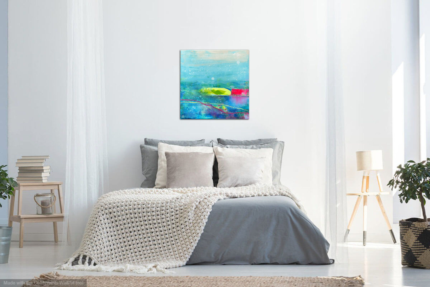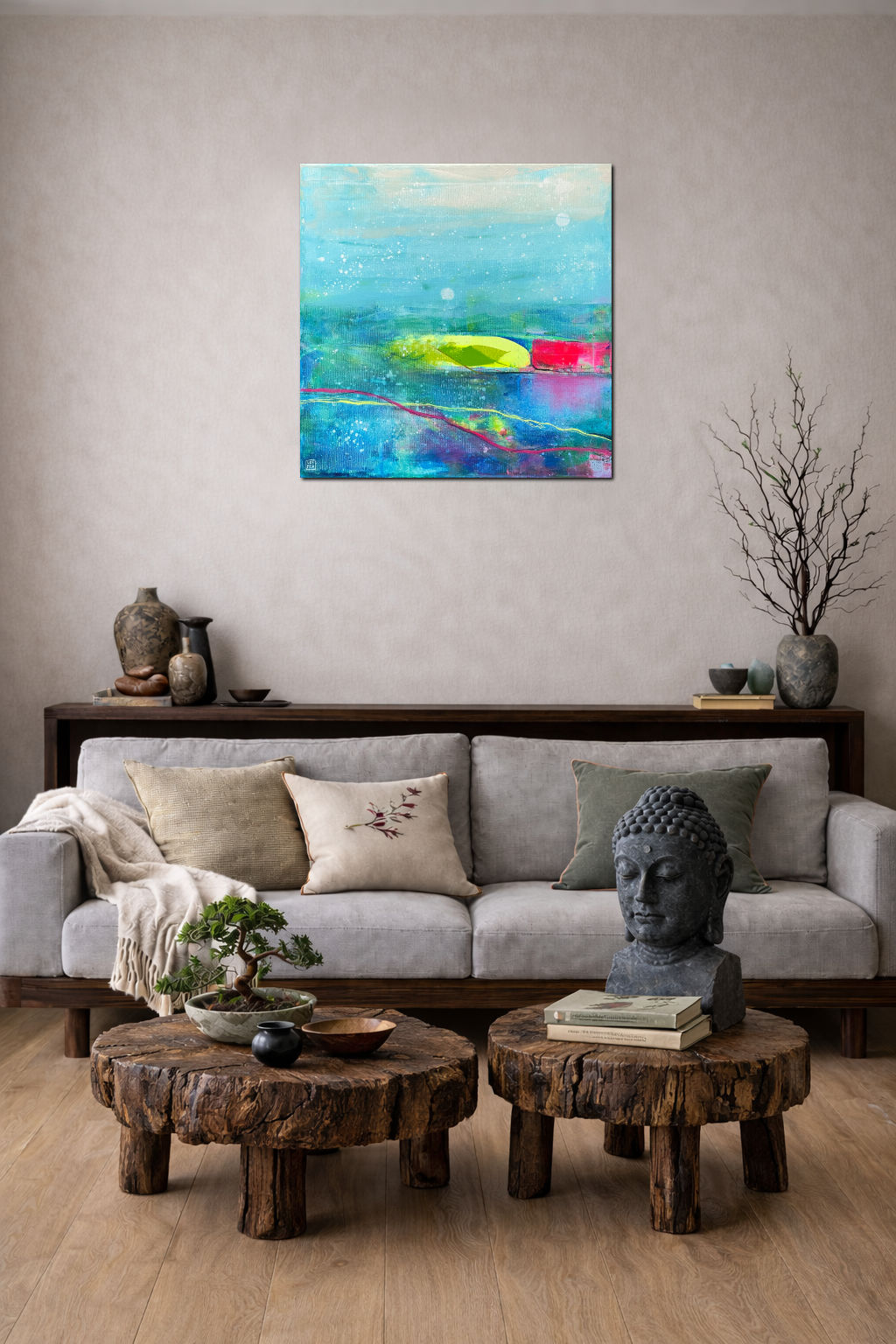 Obraz ticha a zastaveného okamžiku.Horizontální vrstvy připomínají hladinu vodní plochy, velké barevné tvary působí jako světlo či objekty vznášející se na hladině. Přesto obraz není konkrétní krajinou. Je spíše pocitem krajiny.Zve k zastavení a hledání vnitřního ticha. Nepřitahuje hlasitostí, právě proto dokáže prostor kolem sebe ztišit.
