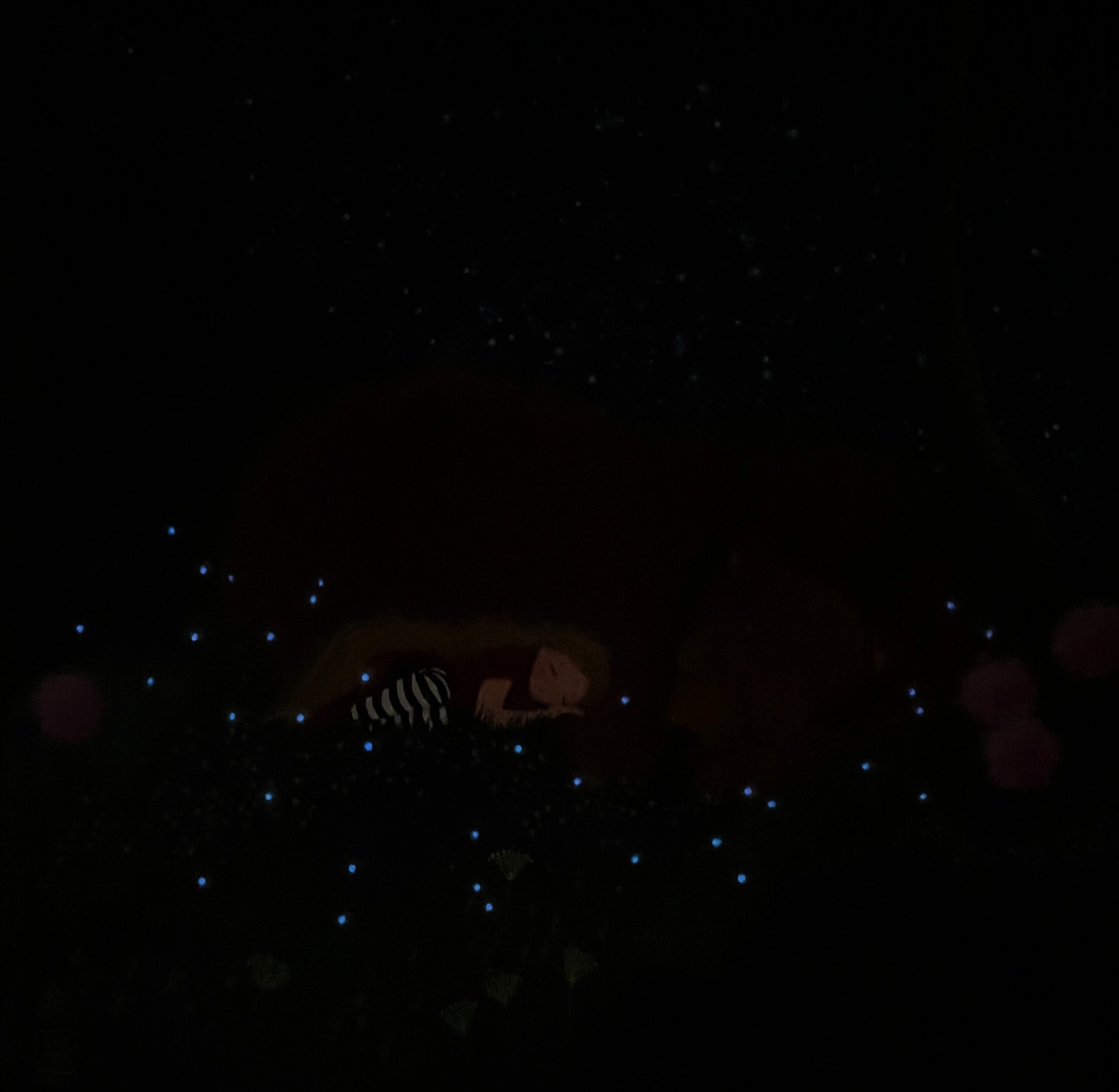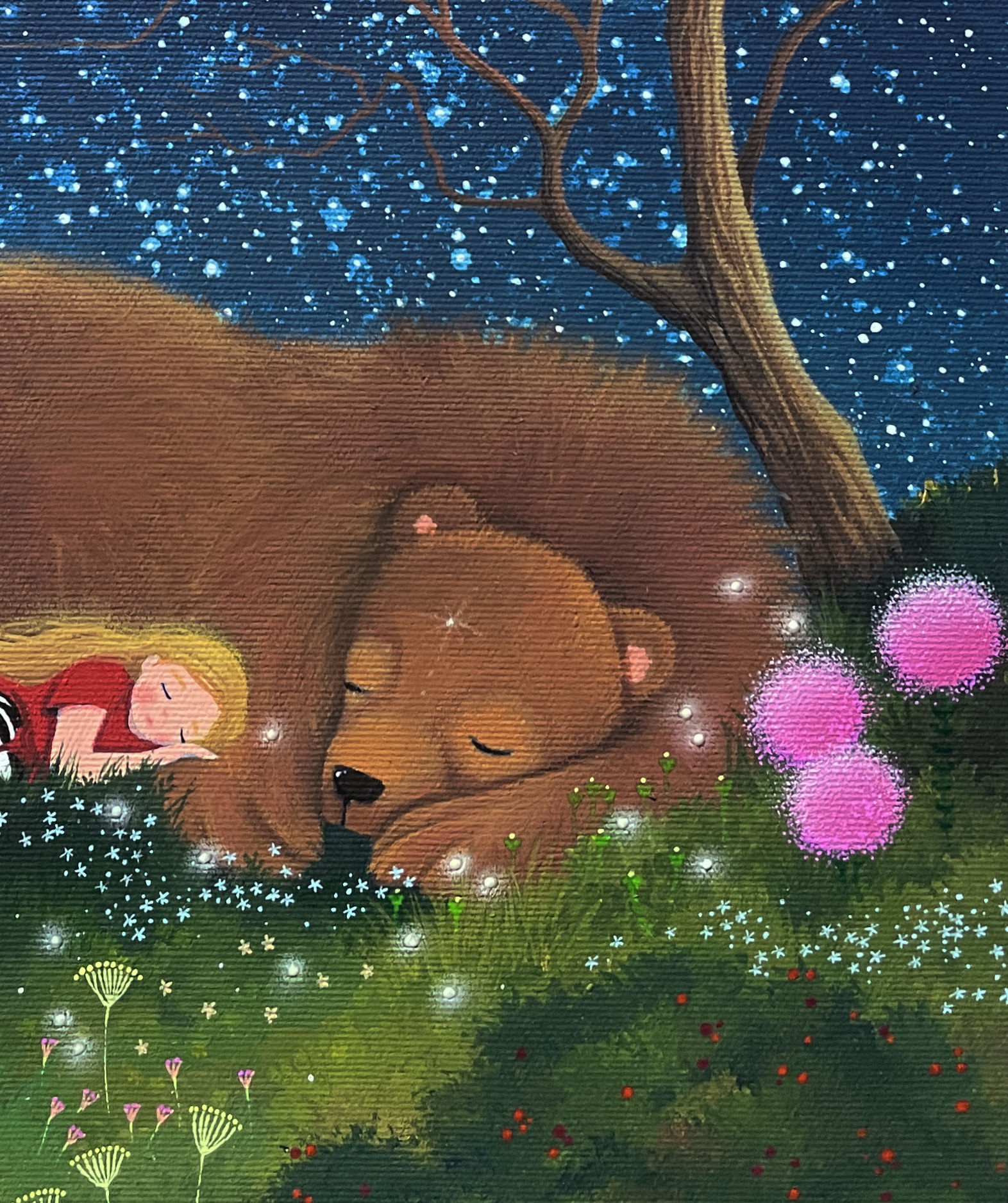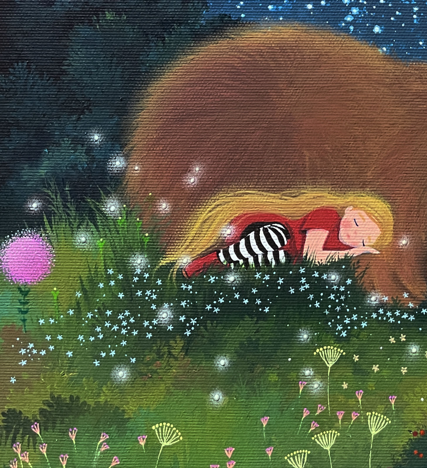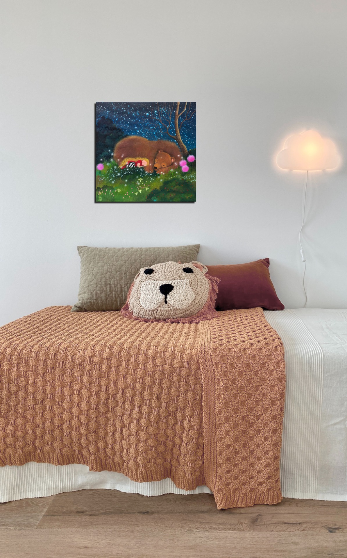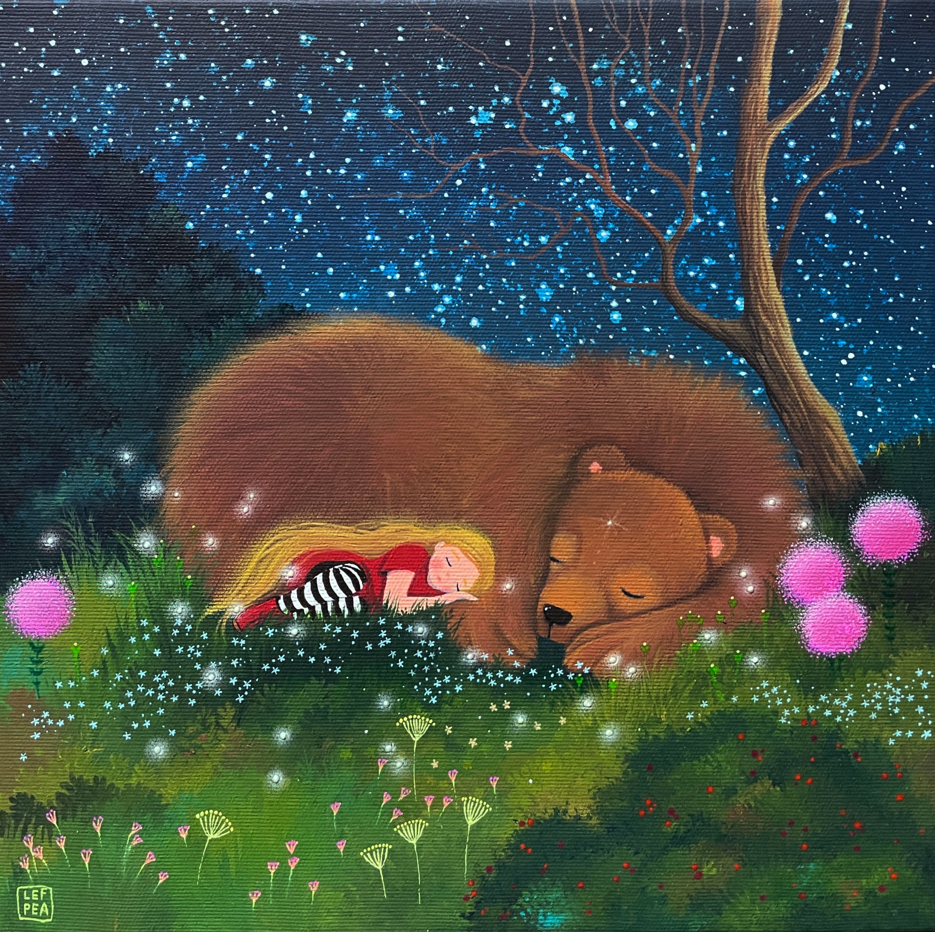 Malé i velké příběhy. Pohádky, při kterých se lépe usíná. Uspávanky z lesa, mechu a z hebkých travin. V klubíčku, bezpečně. Spolu.Barevnost se může ve skutečnosti malinko lišit dle závislosti na nastavení monitoru a množství světla při fotografování. Malovány i hrany, netřeba rámovat. Ošetřeno závěrečným lakem.Signováno LEF PEA. Na obraz i jeho kopie popř. tištěné fotografie se vztahují autorská práva.