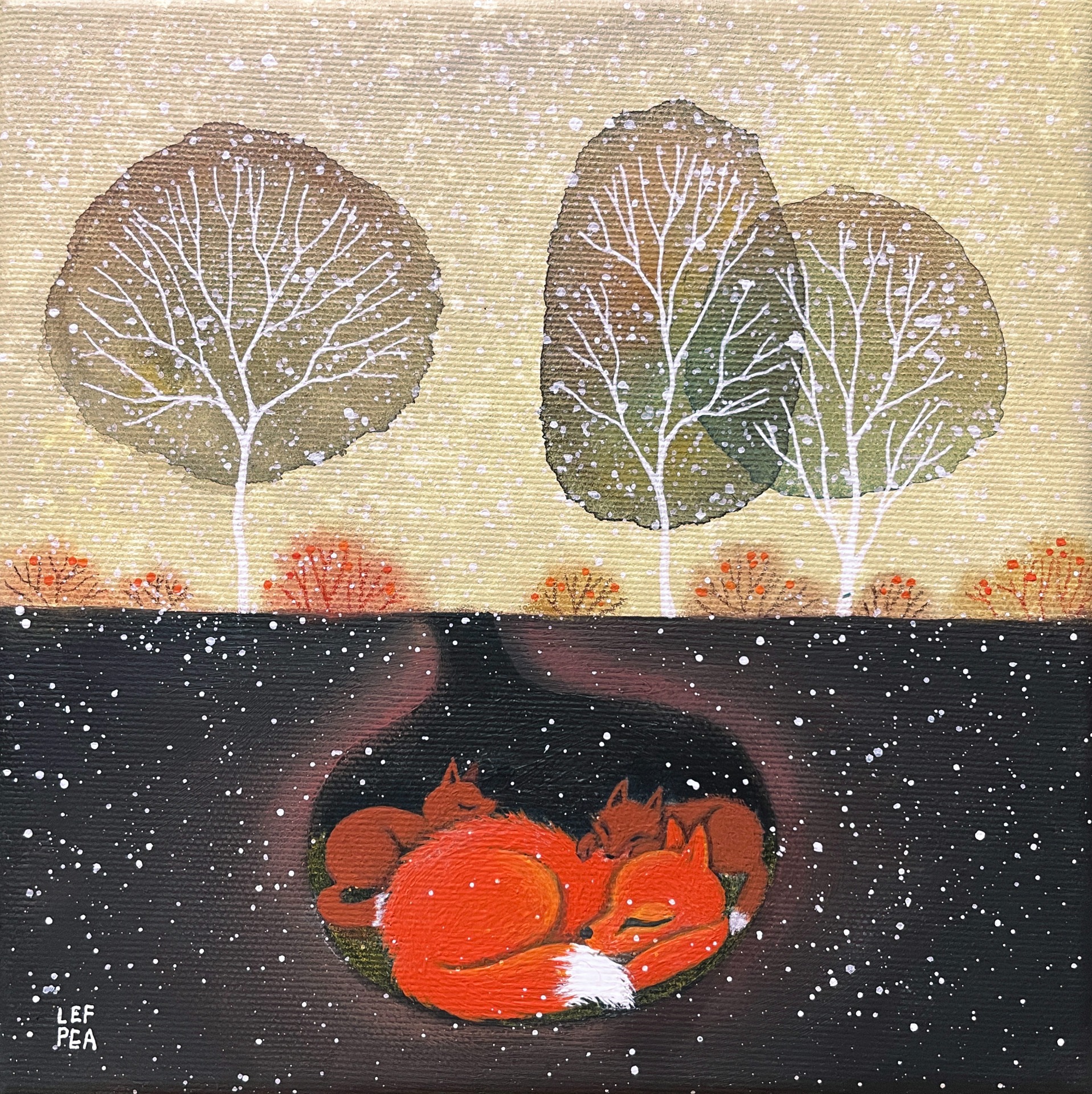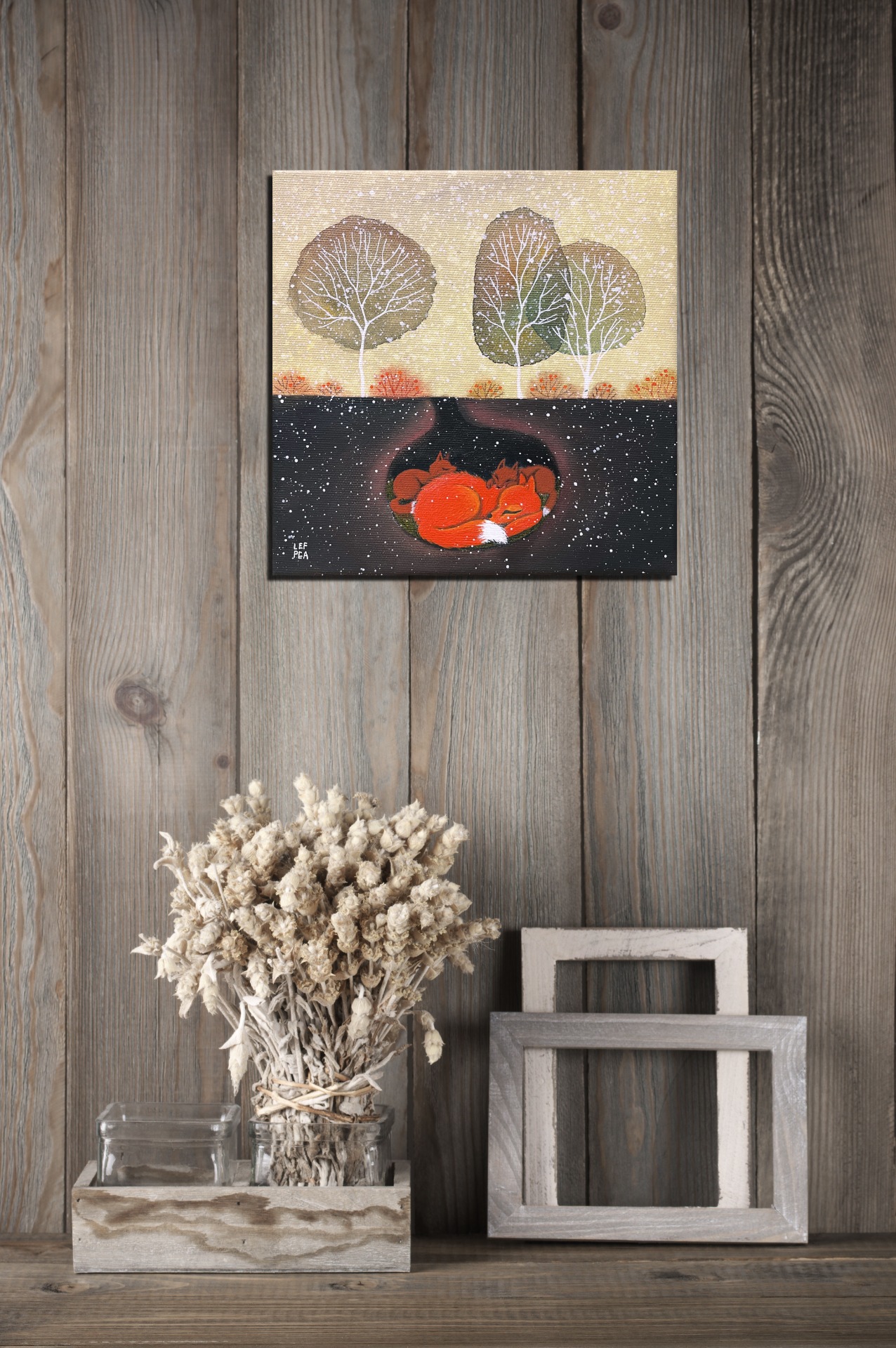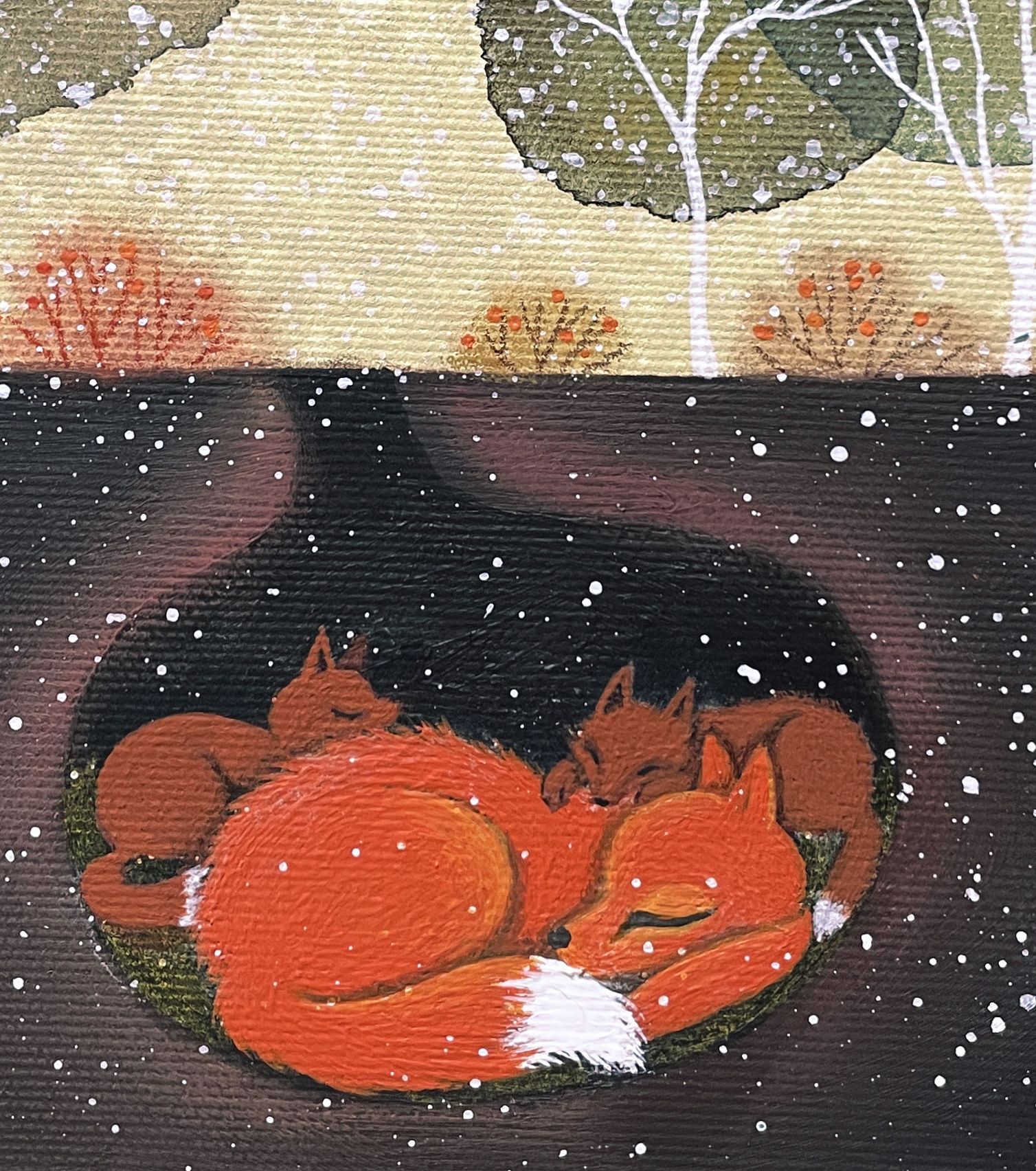S obrazy na plátně prožívám příběh. A s těmi zasněženými ho prožívám o to víc, že vše všechny ty pelíšky pod zemí, schovky, mi dávají pocit bezpečí, který bych chtěla sdílet. V pelíšku, ve vatičce, v peříčku, v hnízdečku...Obraz pro něžnou duši, která ochraňuje malé a ještě menší.