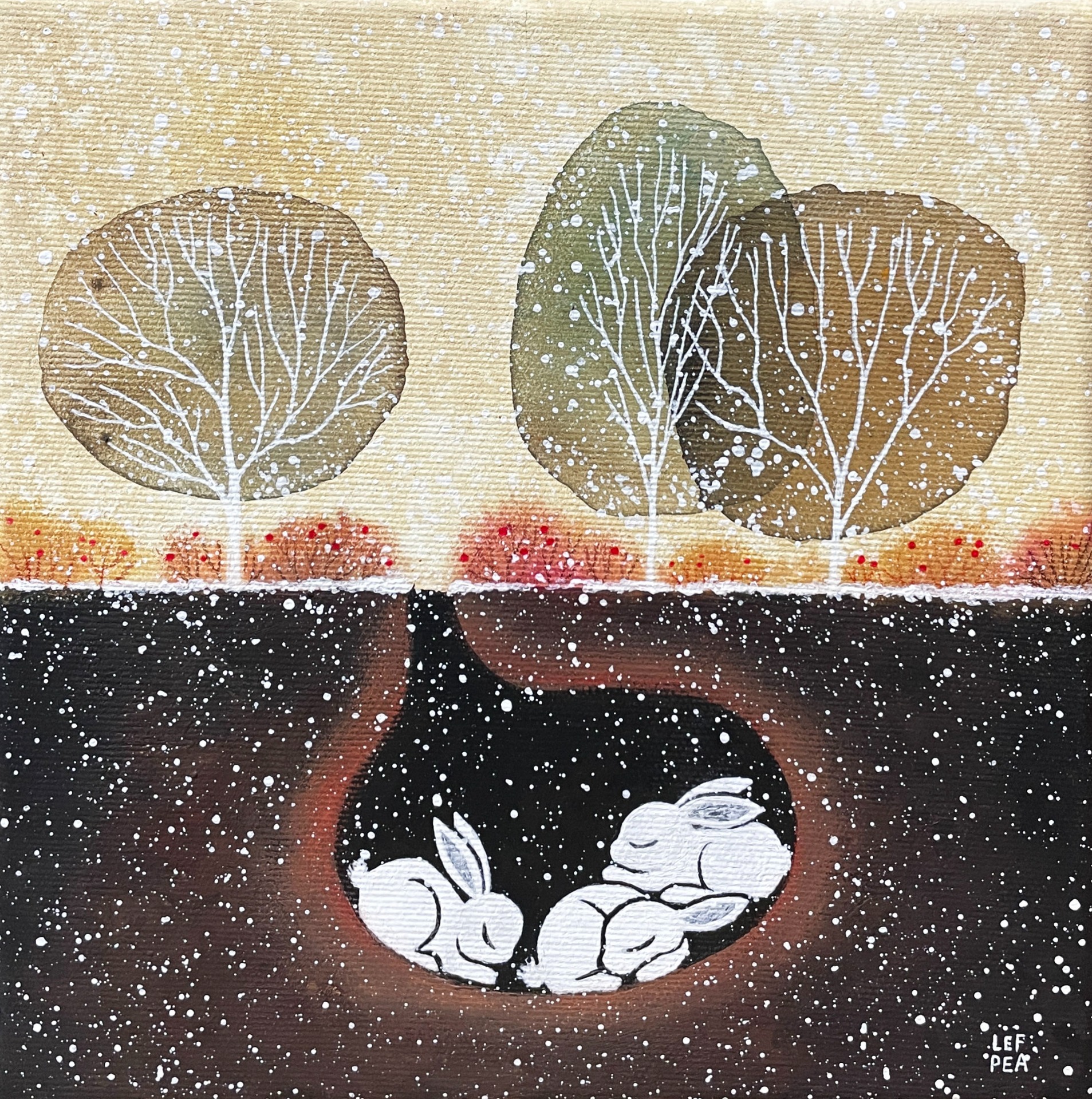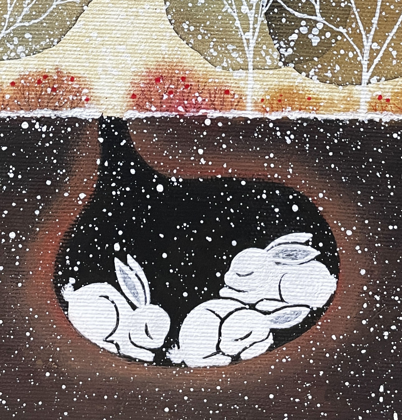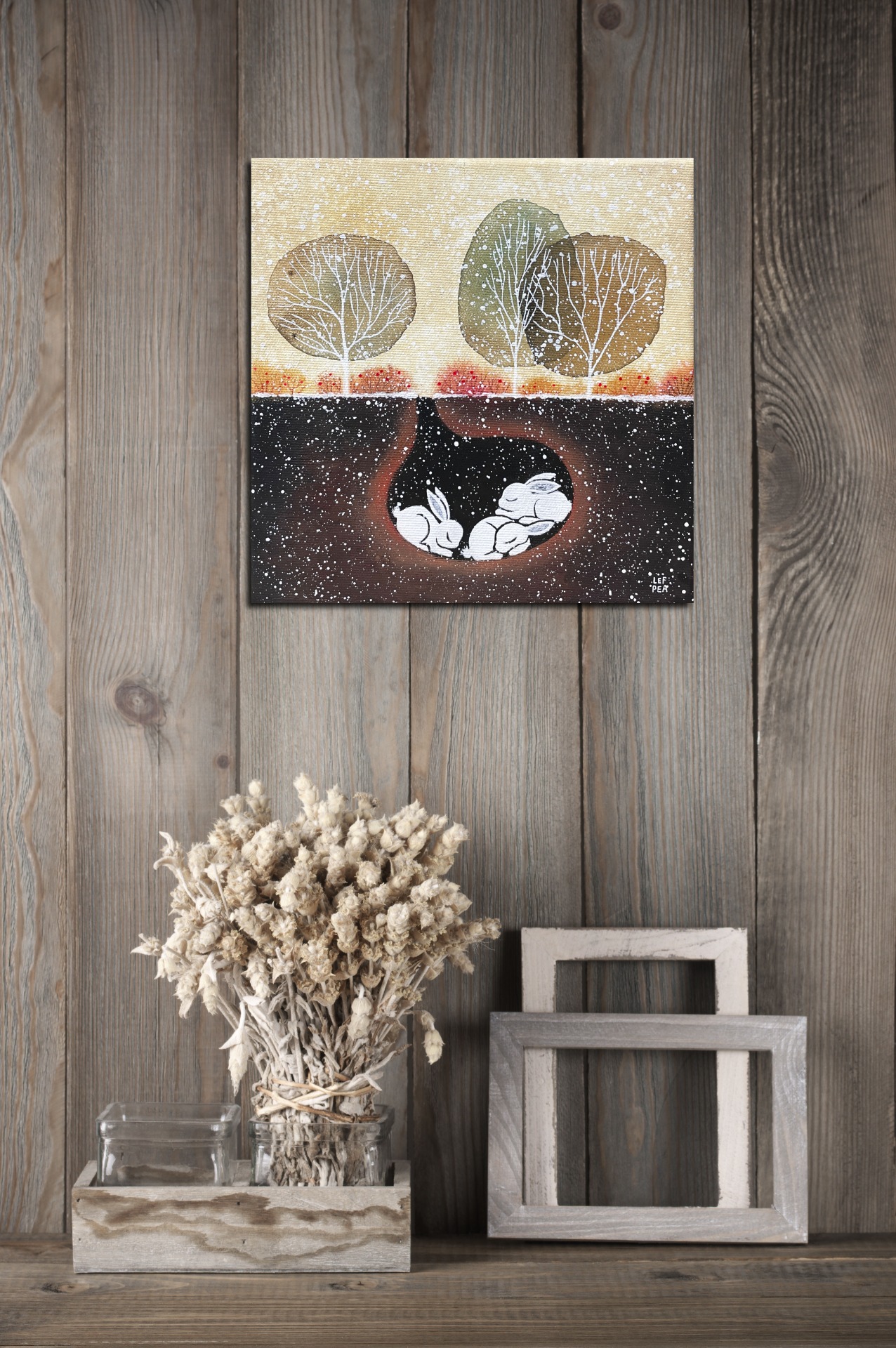S obrazy na plátně prožívám příběh. A s těmi zasněženými ho prožívám o to víc, že vše všechny ty pelíšky pod zemí, schovky, mi dávají pocit bezpečí, který bych chtěla sdílet. V pelíšku, ve vatičce, v peříčku, v hnízdečku...Obraz pro něžnou duši, která ochraňuje malé a ještě menší.