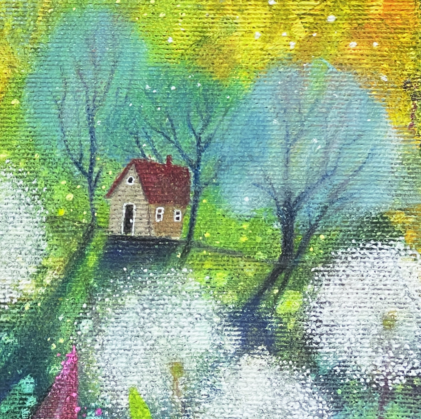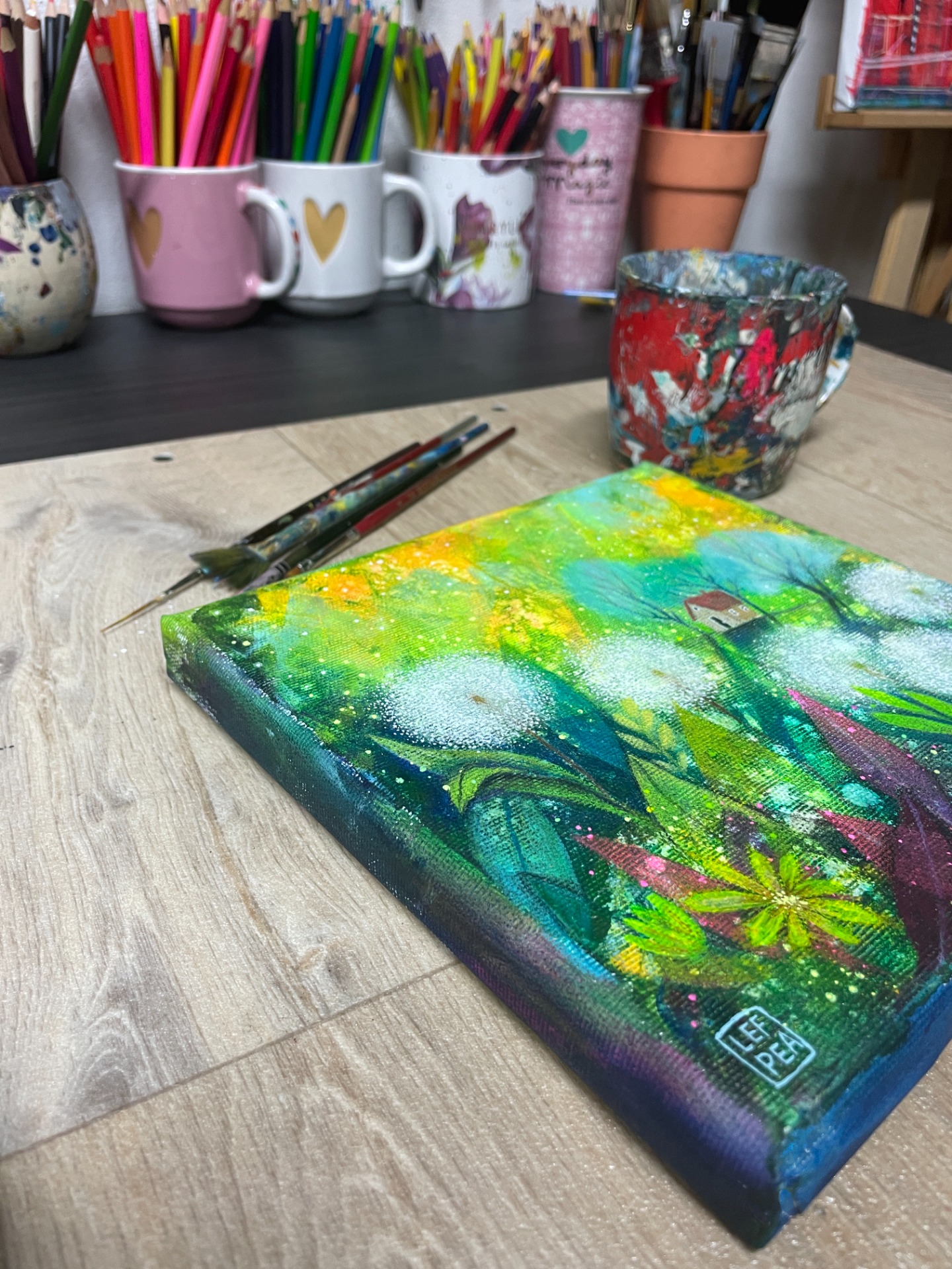 Originál malba, kombinovaná technika: Akryl+pastel, akvarelové pastelky, fixy na plátně, suchý pastel (šepsované plátno natažené na dřevěném rámu), velikost 20x20cm