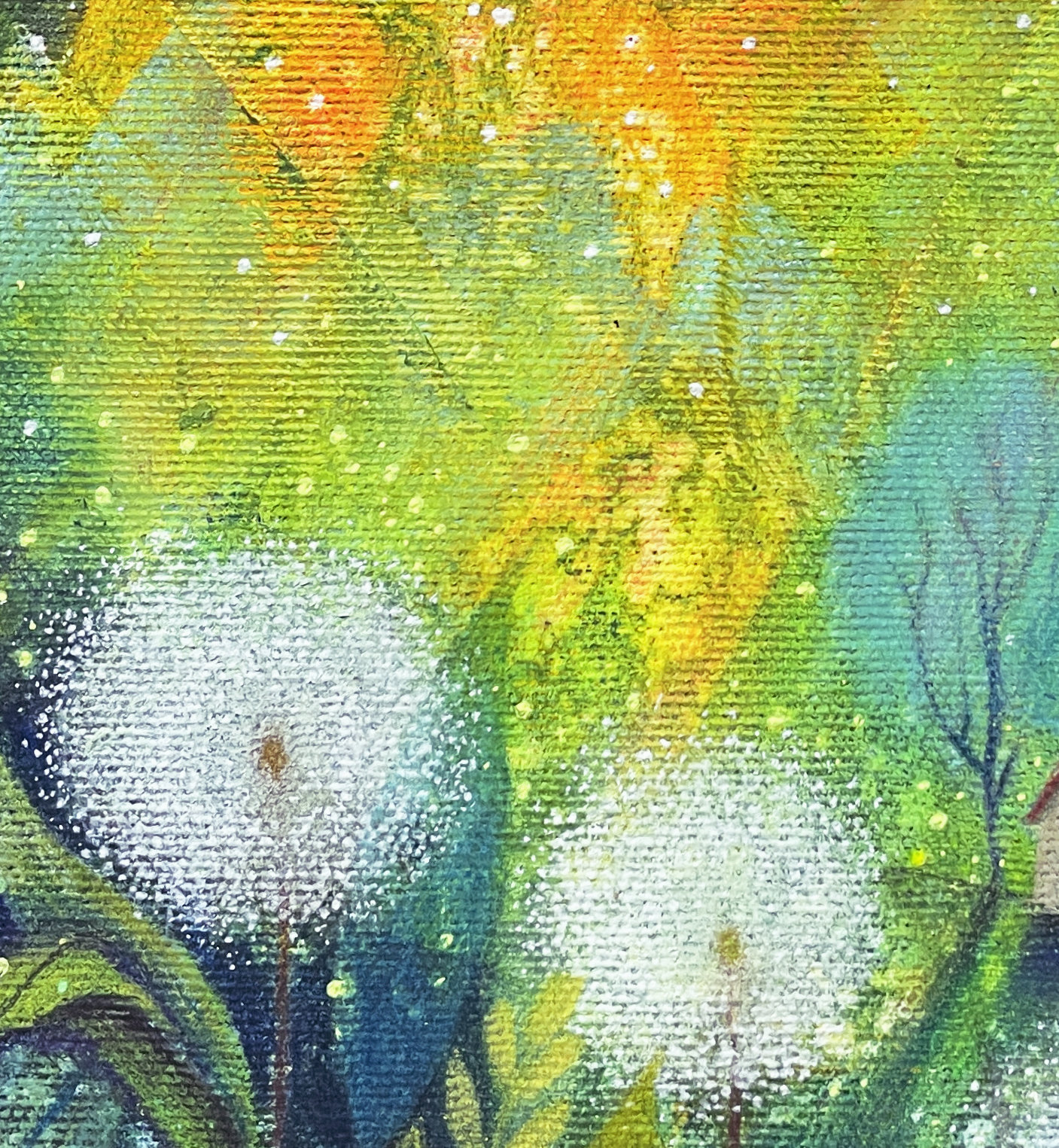 Obraz vznikl spojením akrylu, akvarelových pastelek a fixů, které mu dodávají jemné detaily a snovou atmosféru. Každý tah štětce, každá linka v sobě nese kousek onoho tajemství – světa, který možná není viditelný, ale lze ho cítit.