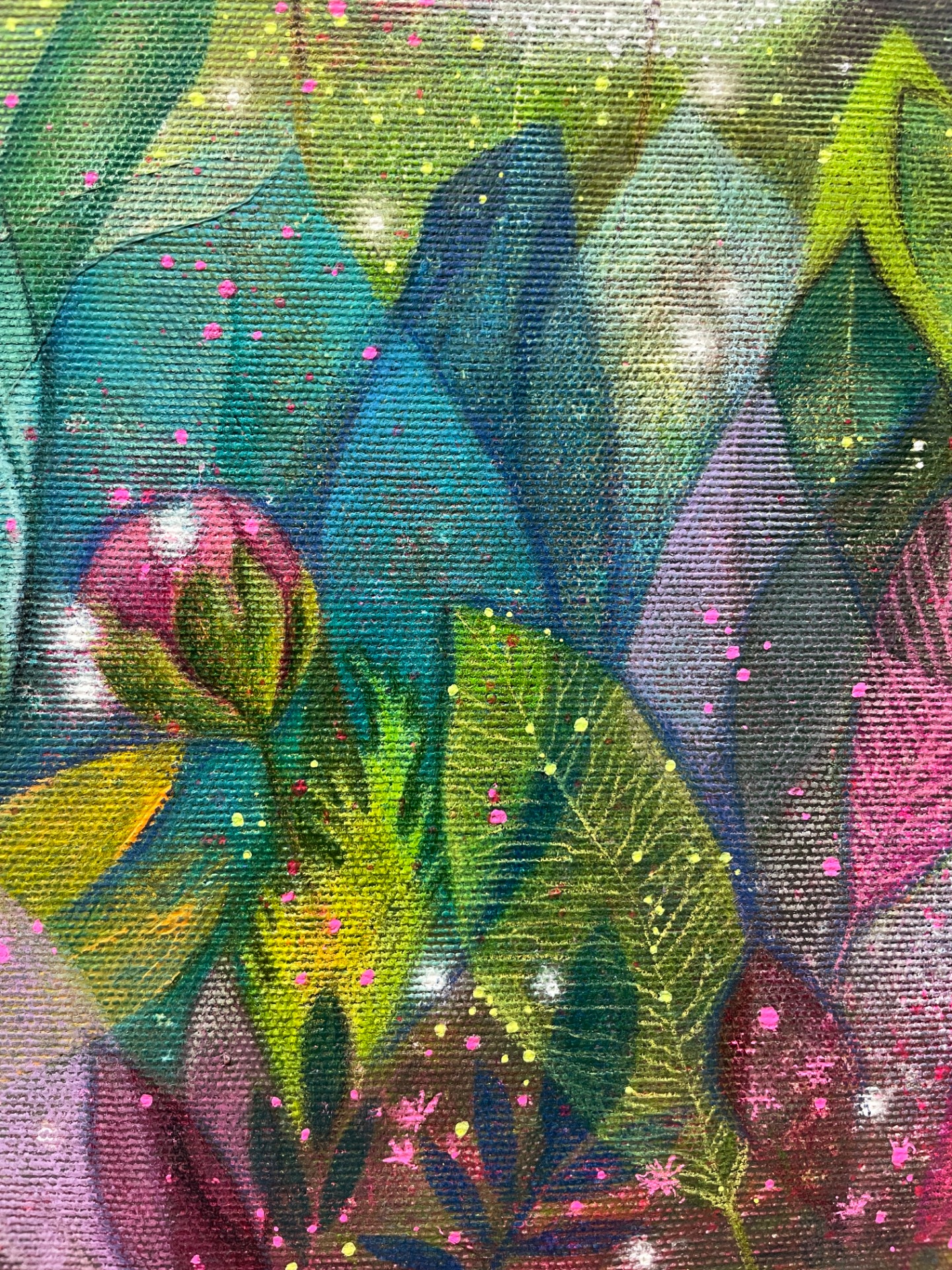 Obraz vznikl spojením akrylu, akvarelových pastelek a fixů, které mu dodávají jemné detaily a snovou atmosféru. Každý tah štětce, každá linka v sobě nese kousek onoho tajemství – světa, který možná není viditelný, ale lze ho cítit.