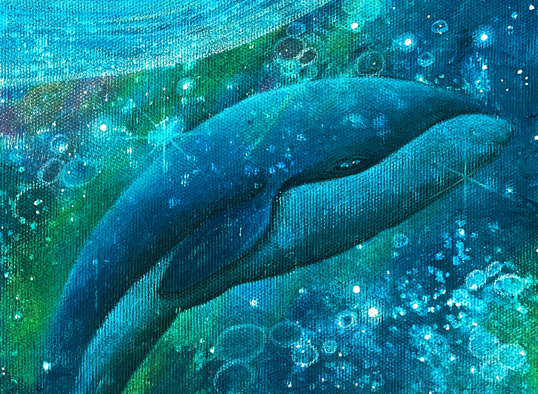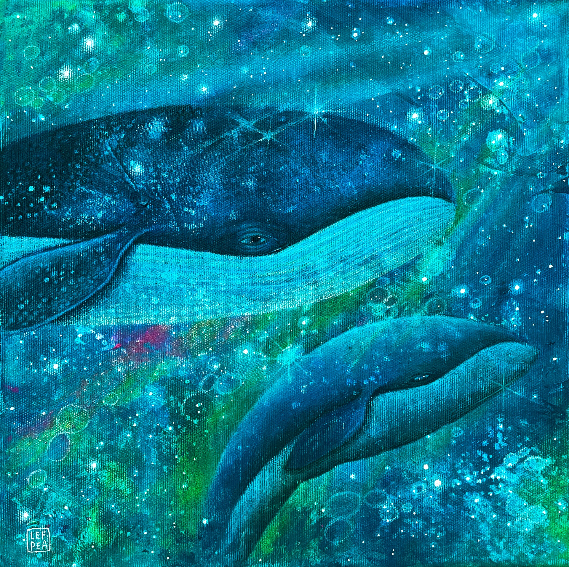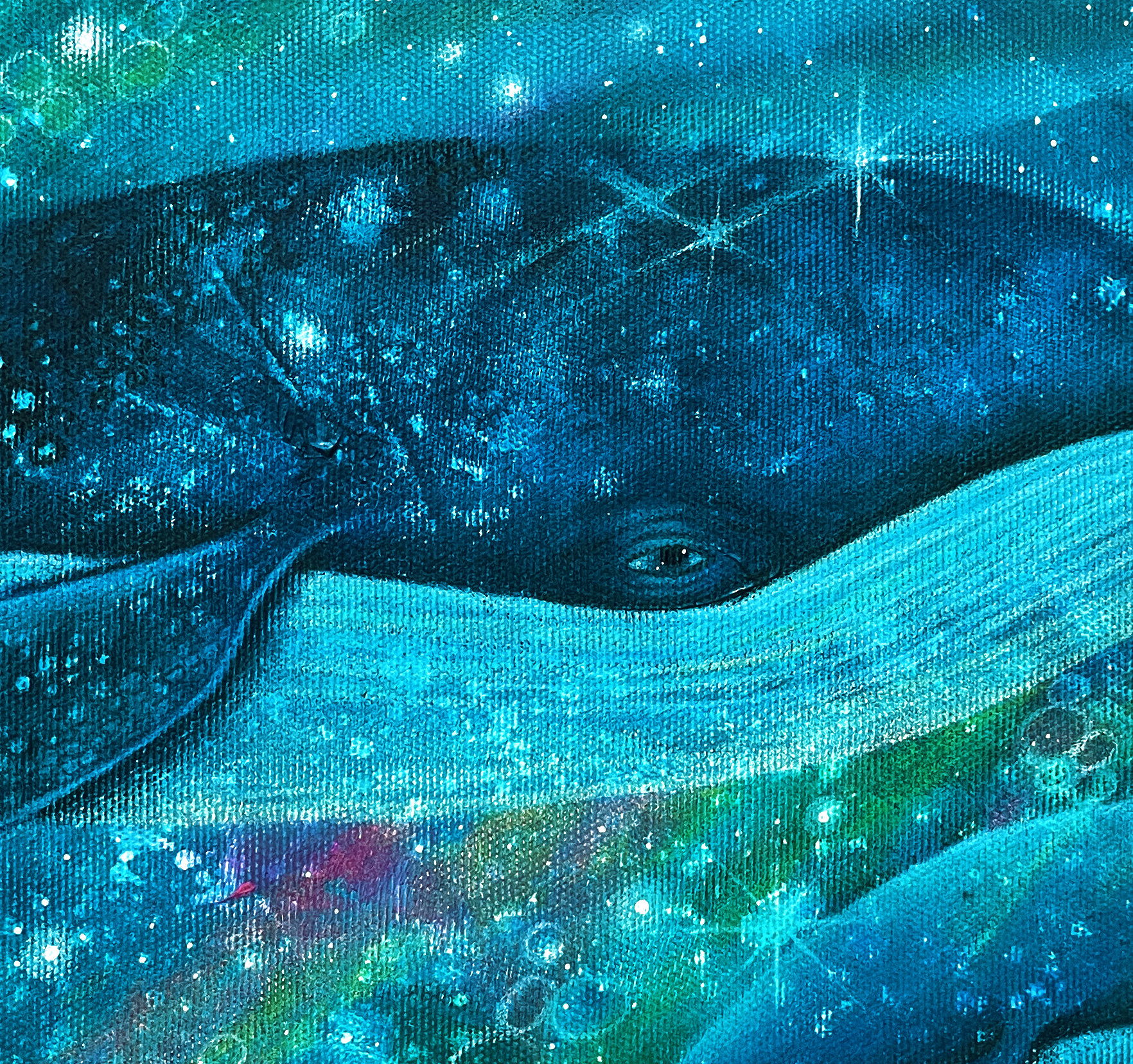 Když se ponoříme do hlubin své duše, objevujeme svět, který je krásný, okouzlující a nekonečně bohatý. *Tento obraz je zvláštní svou duálností, kdy divák sám rozhodne, jestli se dívá na hvězdnou oblohu nebo pod hladinu oceánu. Tento efekt je dosažen díky tmavým a hlubokým barvám a kombinací realistických velryb se souhvězdími.